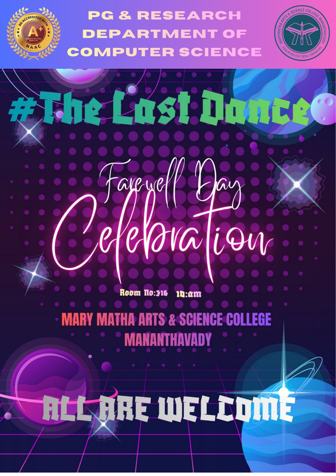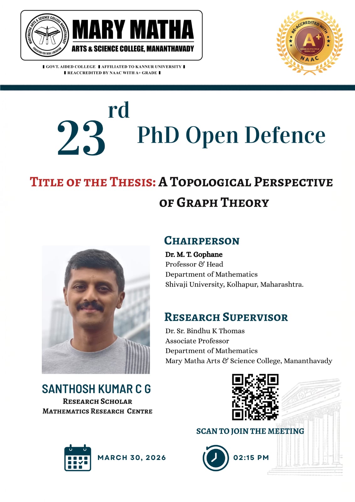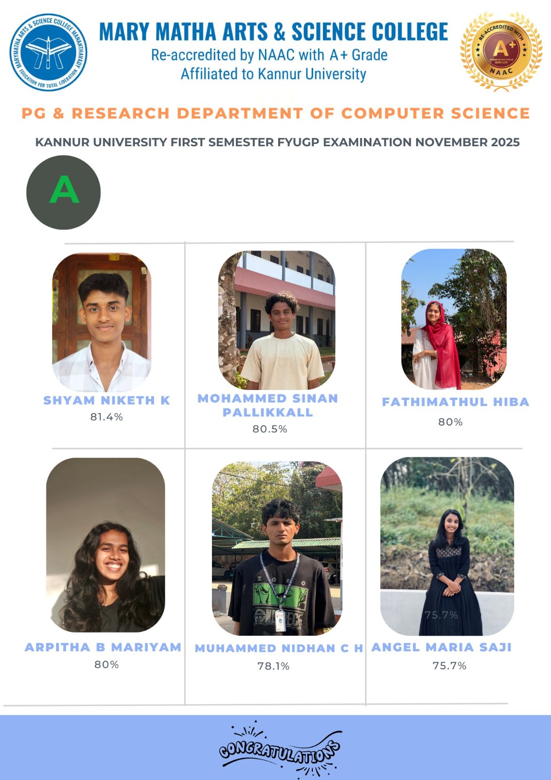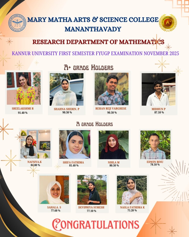 - College re-accredited with a grade of A+ (CGPA 3.34) in the 4th Cycle of NAAC Accreditation.