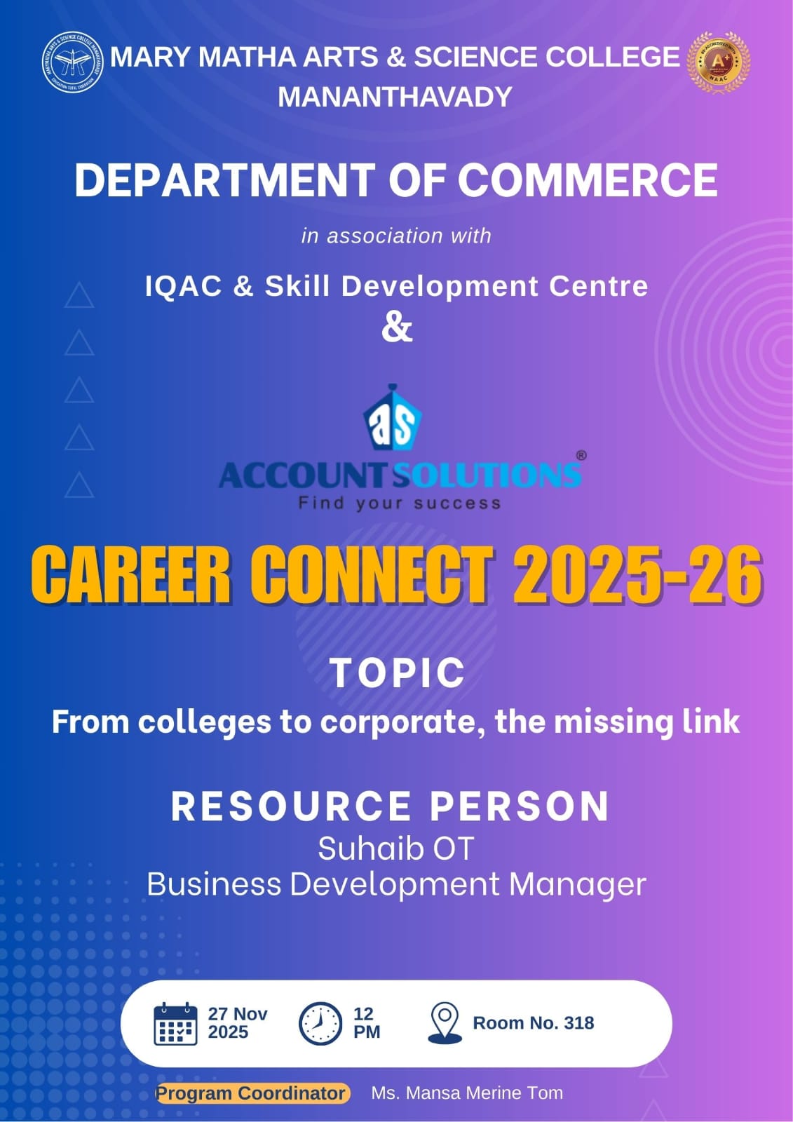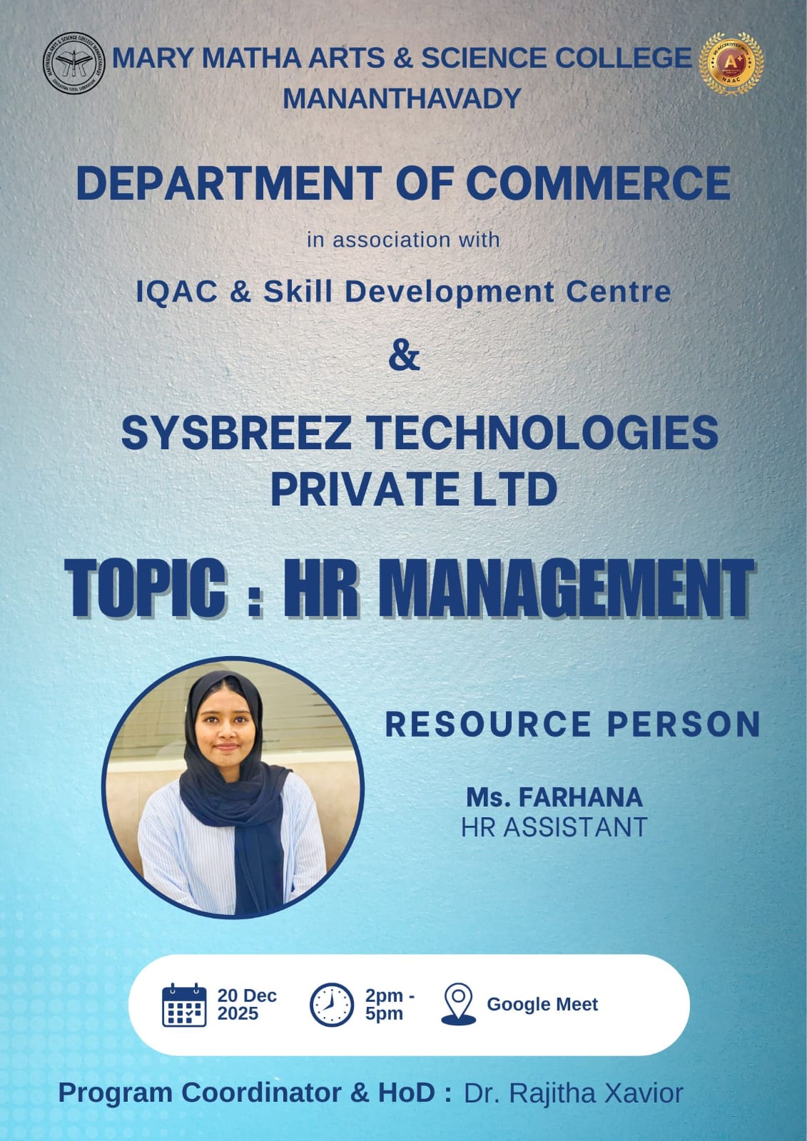 The three-year regular B.Sc. Physics degree course was started in Mary Matha Arts and Science College in the year 2014.