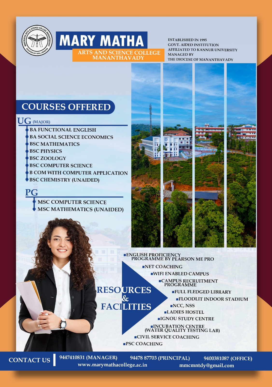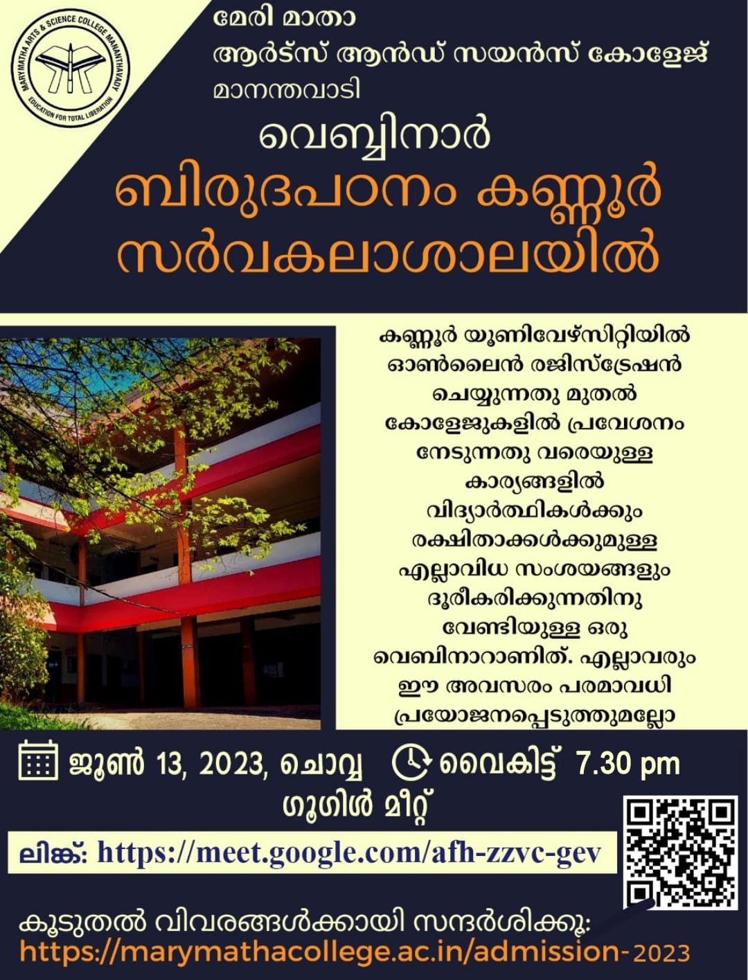 കണ്ണൂർ സർവകലാശാലയിലെ വിവിധ കോളേജുകളിലേക്ക് ഡിഗ്രി പ്രവേശനം നടക്കുന്ന ഈ സാഹചര്യത്തിൽ ബിരുദ/ബിരുദാനന്തരബിരുദ കോഴ്സുകളിലേക്ക് പ്രവേശനം നേടാൻ ആഗ്രഹിക്കുന്ന വിദ്യാർത്ഥികൾക്കും അവരുടെ രക്ഷിതാക്കൾക്കുമായി മാനന്തവാടി മേരി മാതാ ആർട്സ് & സയൻസ് കോളേജ് അഡ്മിഷൻ സെല്ലിൻ്റെയും ഐ.ക്യൂ.ഏ.സി.യുടെയും സംയുക്താഭിമുഖ്യത്തിൽ 'ബിരുദപഠനം കണ്ണൂർ സർവകലാശാലയിൽ' എന്ന വിഷയത്തിൽ ഒരു ഏകദിന വെബിനാർ 2023 ജൂൺ 13 (ചൊവ്വ) വൈകിട്ട് 7:30 ന് നടക്കുന്നു. ഗൂഗിൾ മീറ്റിൽ നടത്തപ്പെടുന്ന പരിപാടിയിൽ മേരി മാതാ ആർട്സ് & സയൻസ് കോളേജിലെ അഡ്മിഷൻ നോഡൽ ഓഫീസർ ഡോ ഗീത ആൻ്റണി പുല്ലൻ വിഷയാവതരണം നടത്തുകയും ബിരുദപ്രവേശന സംബന്ധമായ കാര്യങ്ങളിൽ വിദ്യാർത്ഥികളുടെയും രക്ഷിതാക്കളുടെയും സംശയങ്ങൾക്ക് ഉത്തരം നൽകുകയും ചെയ്യുന്നു. മീറ്റിംഗ് ലിങ്ക് : https://meet.google.com/afh-zzvc-gev കൂടുതൽ വിവരങ്ങൾക്കായി കോളേജ് വെബ്സൈറ്റ് സന്ദർശിക്കുക: https://marymathacollege.ac.in/admission-2023