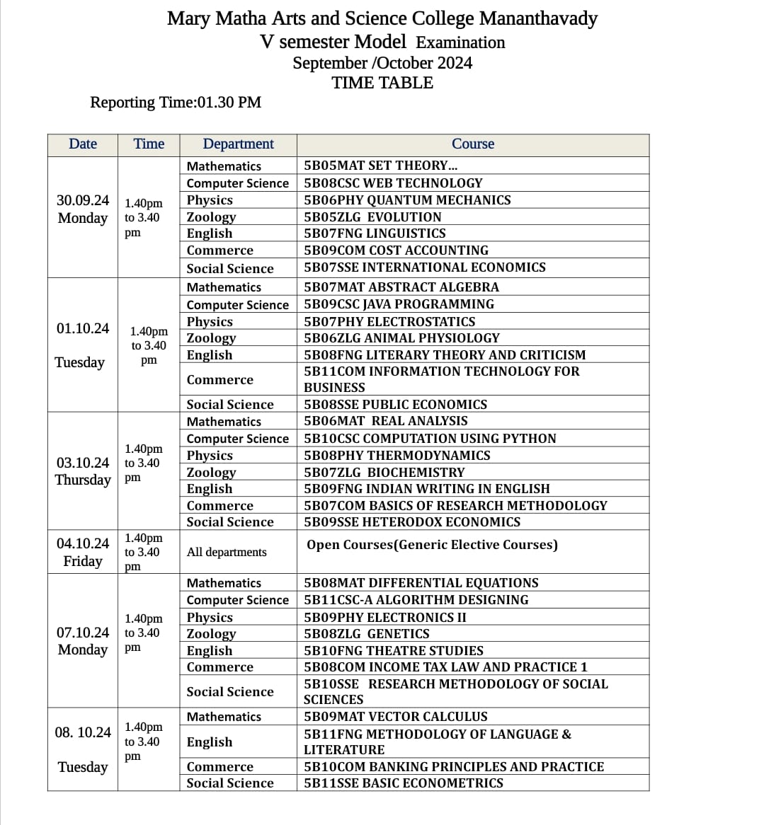 Fifth semester model examination time table