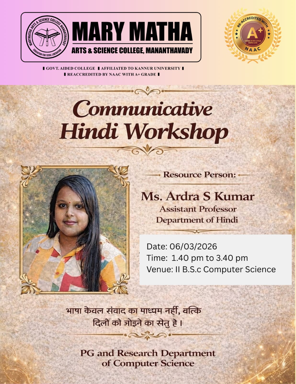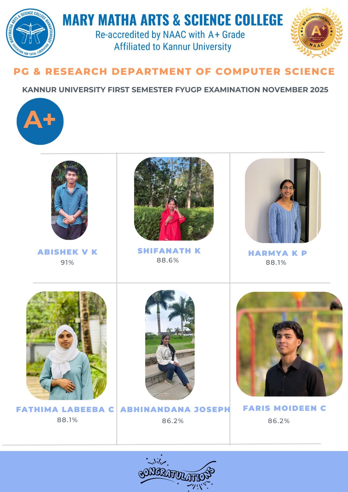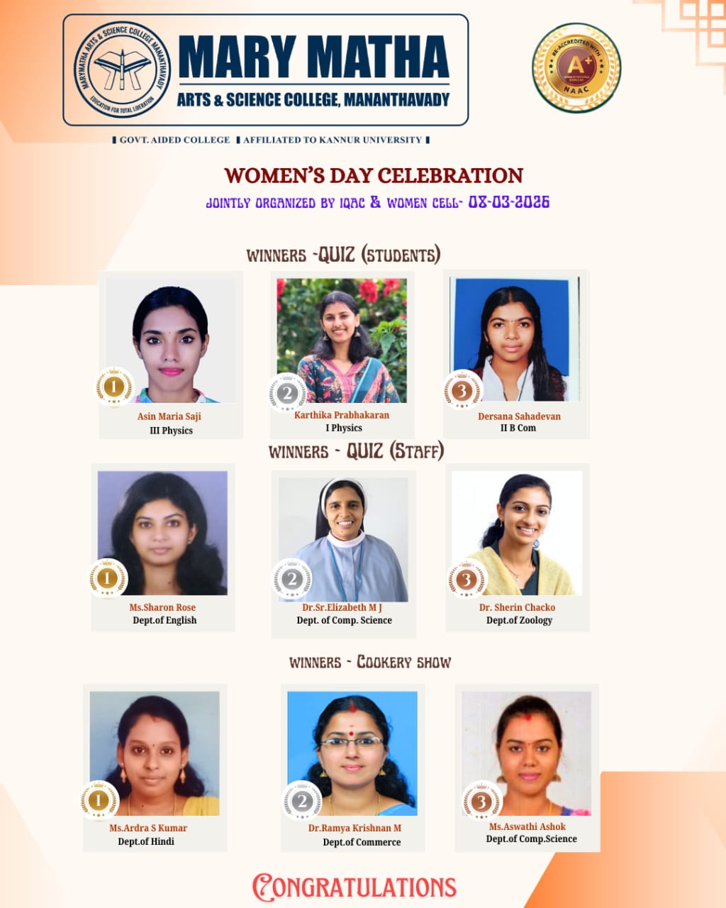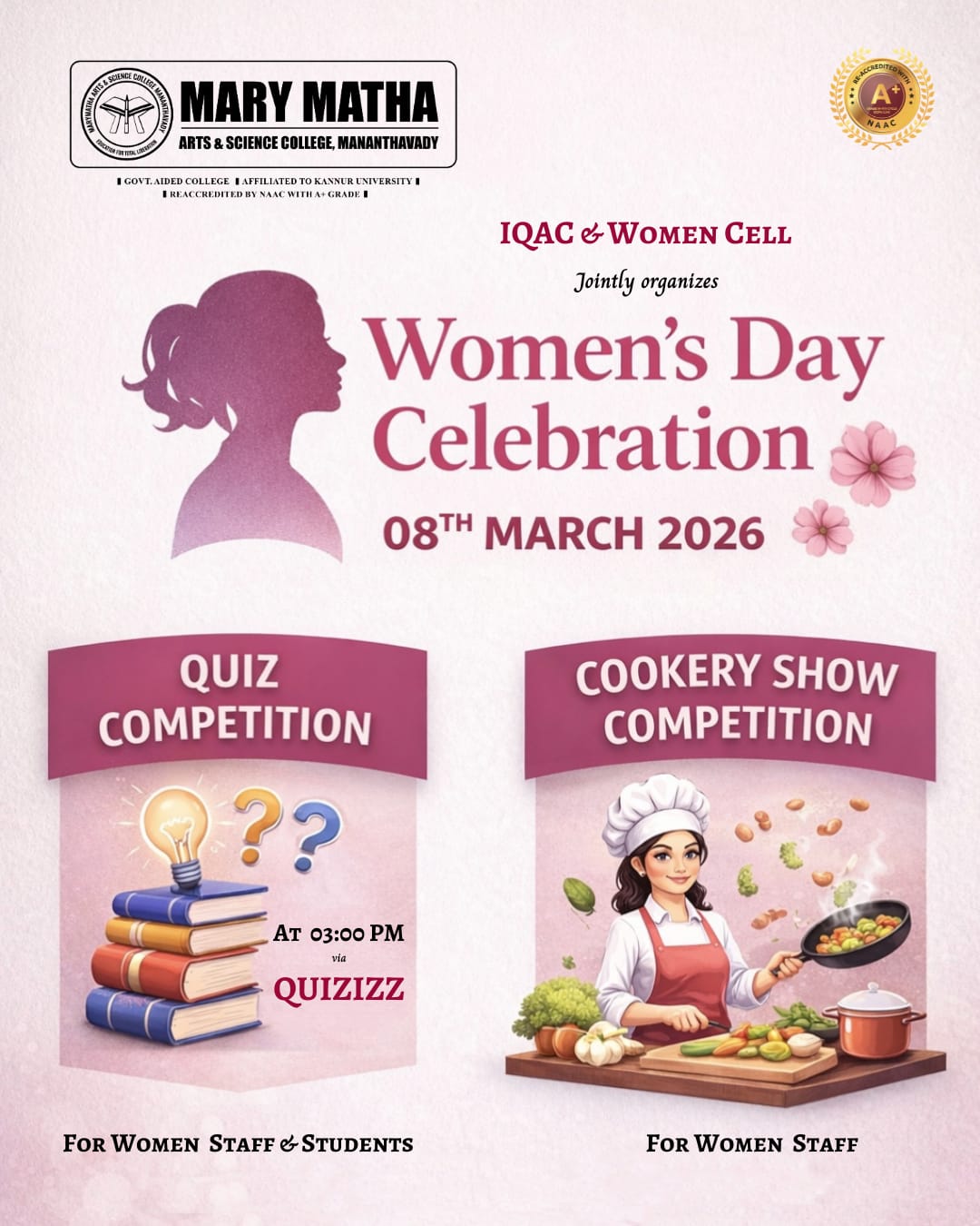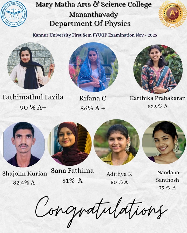 - College re-accredited with a grade of A+ (CGPA 3.34) in the 4th Cycle of NAAC Accreditation.