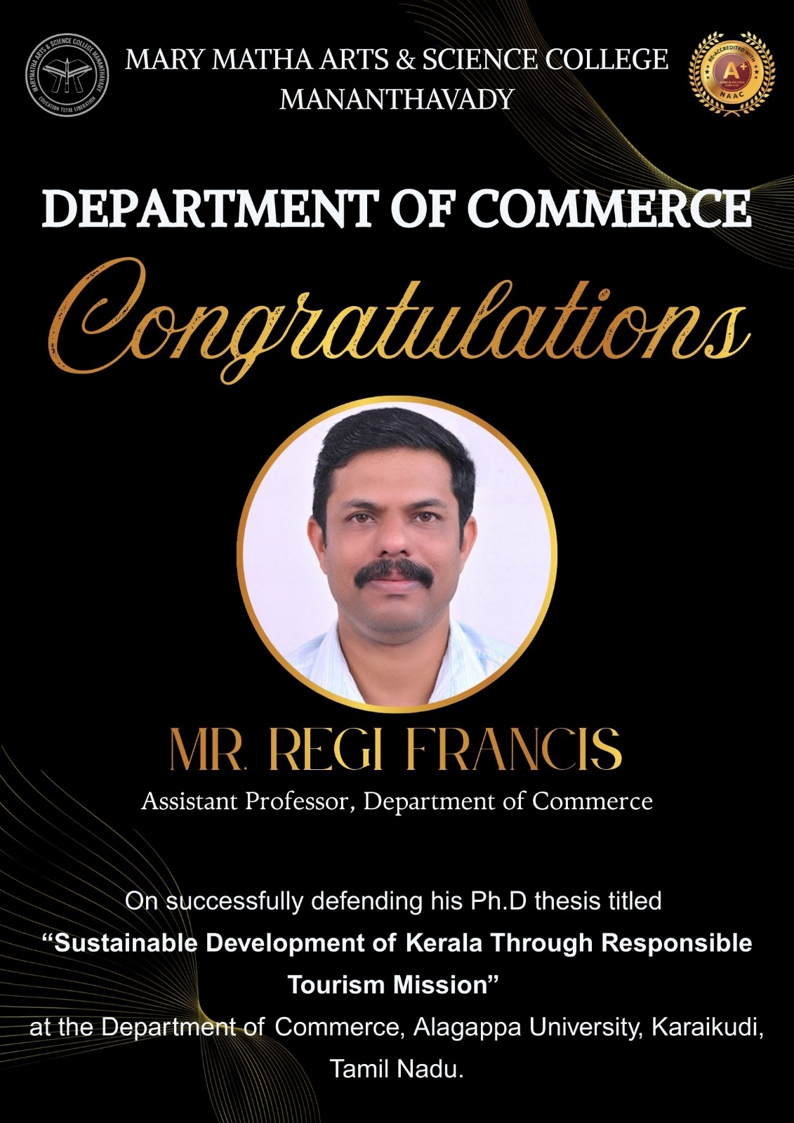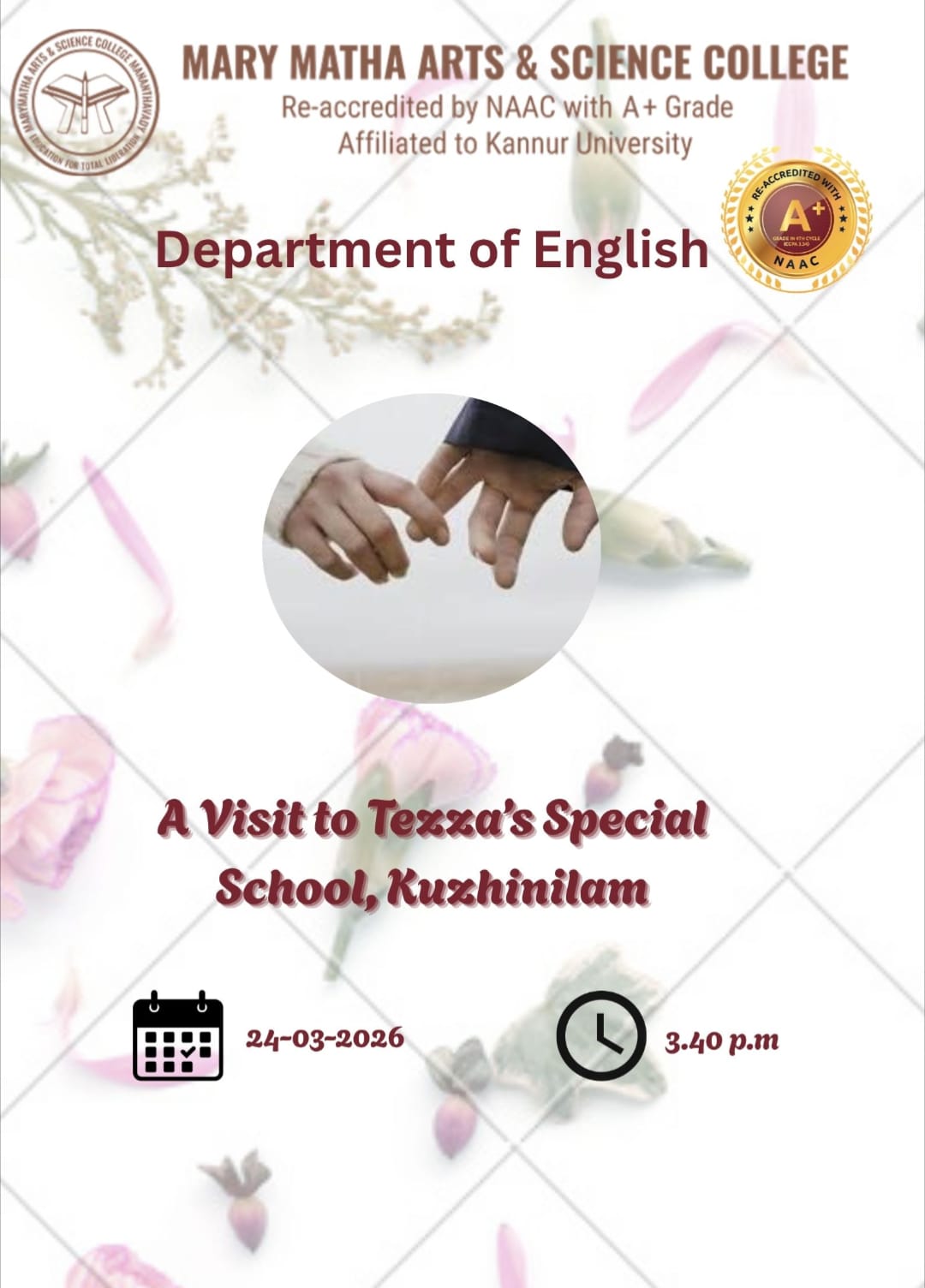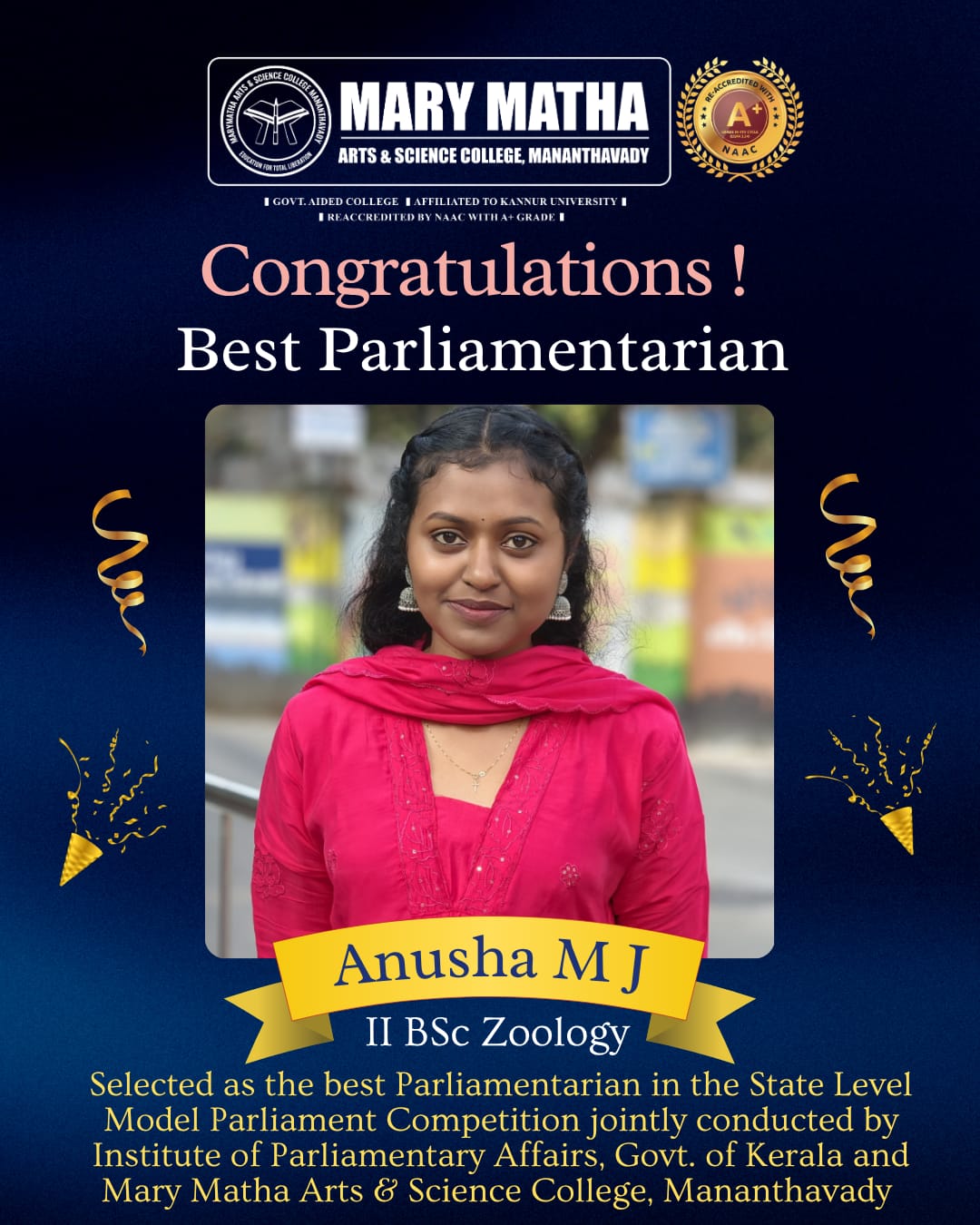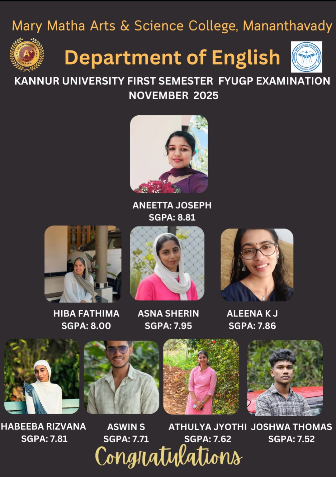 - College re-accredited with a grade of A+ (CGPA 3.34) in the 4th Cycle of NAAC Accreditation.