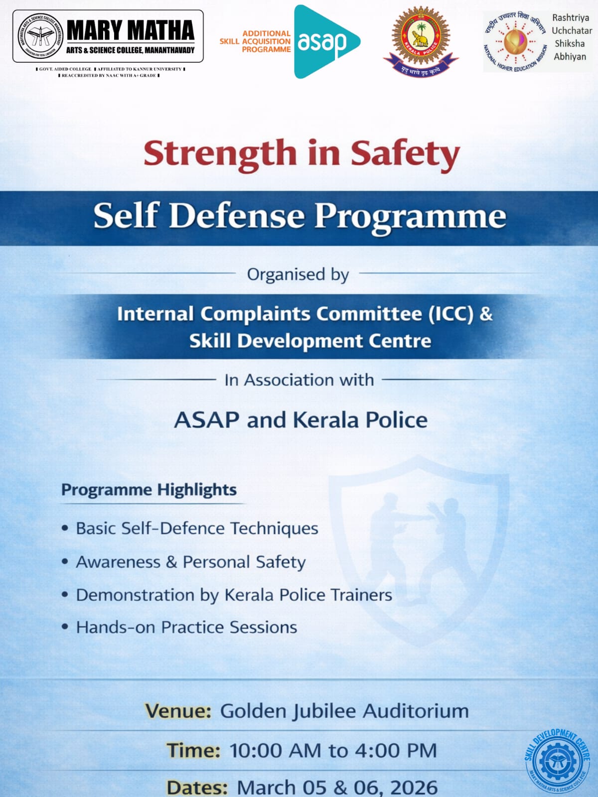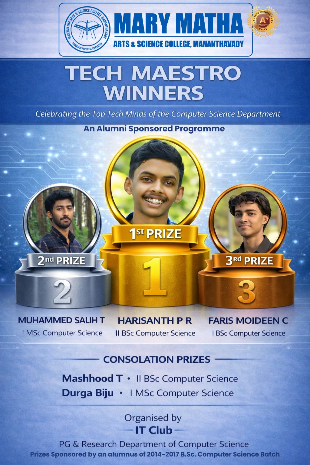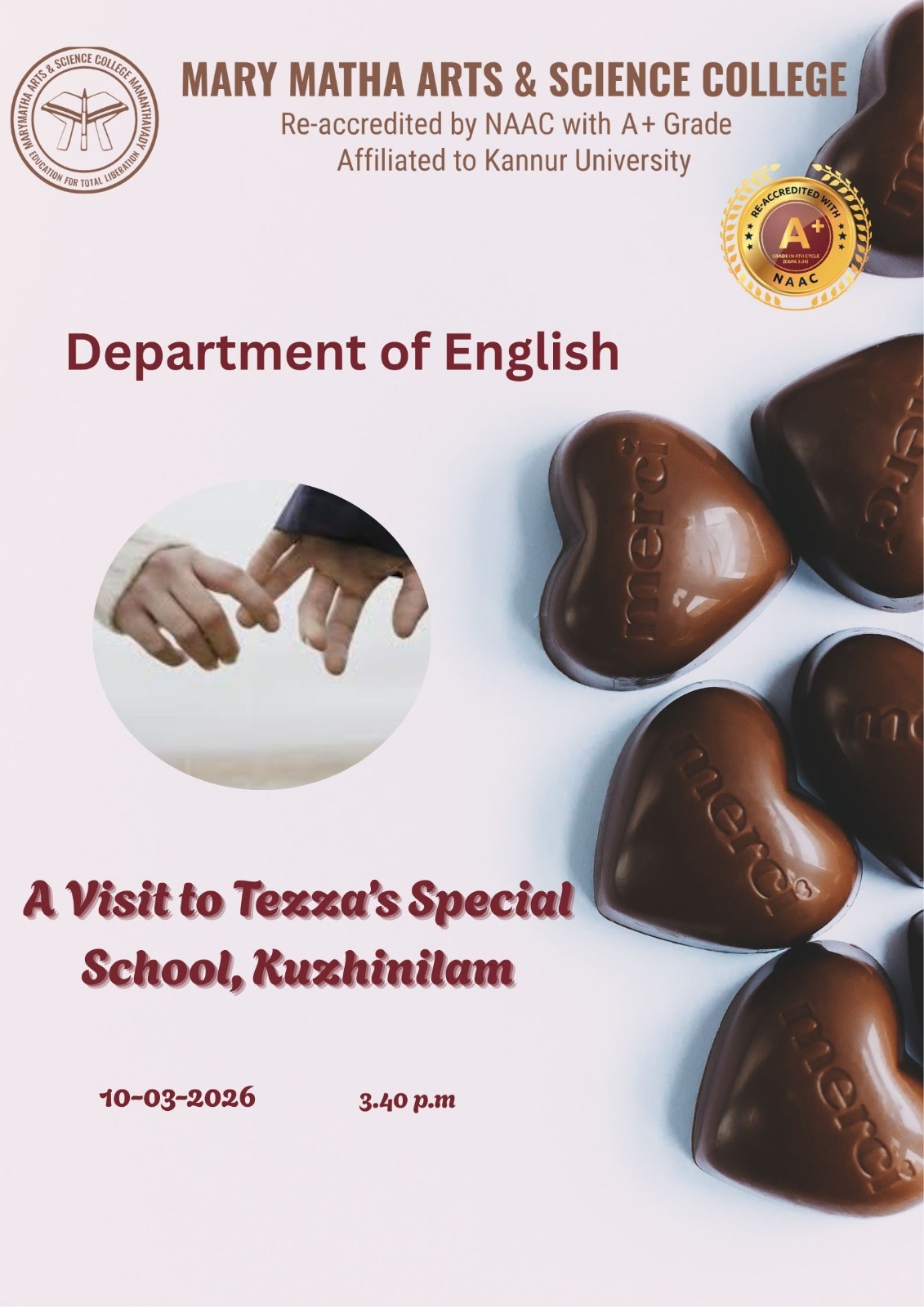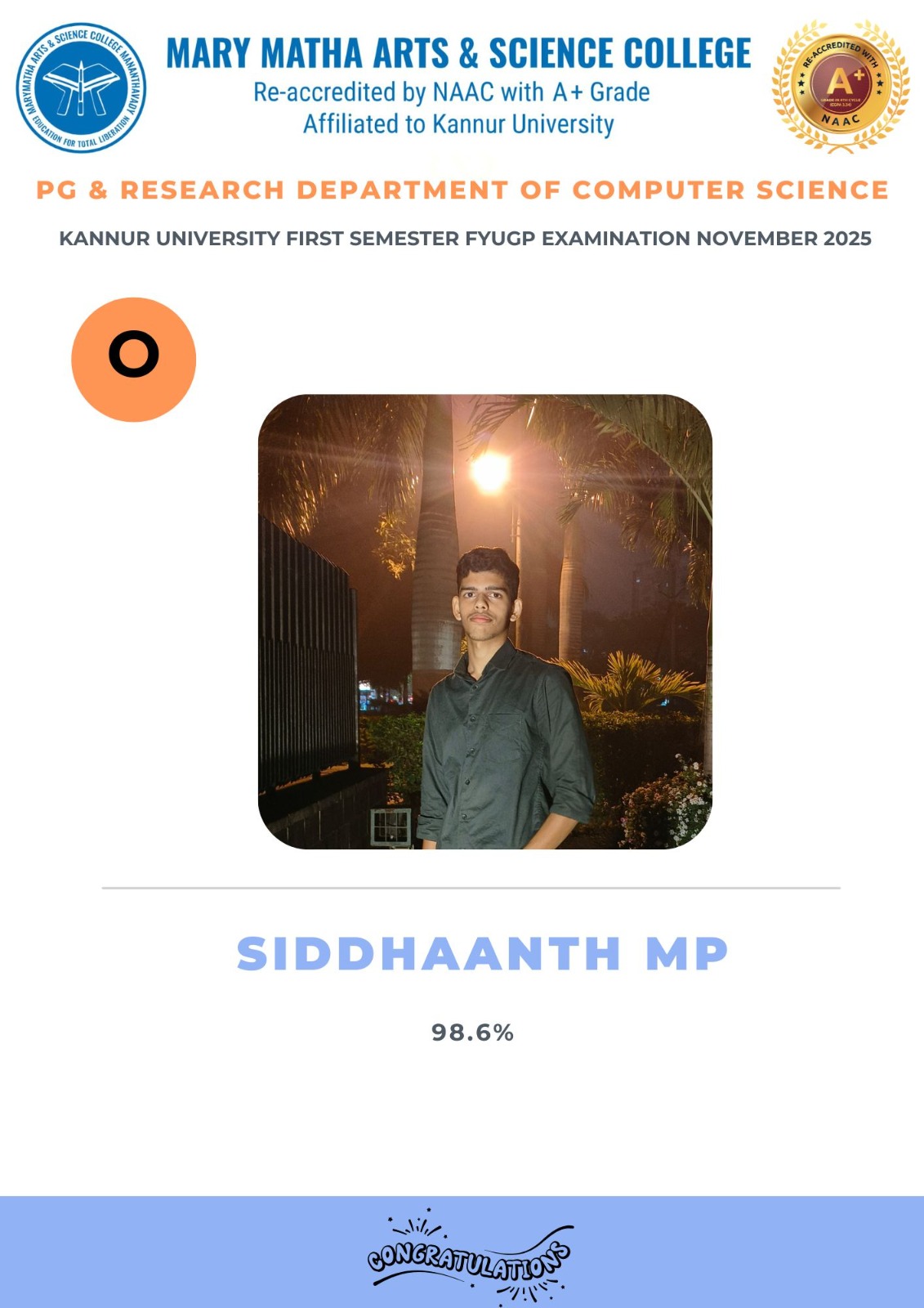- College re-accredited with a grade of A+ (CGPA 3.34) in the 4th Cycle of NAAC Accreditation.