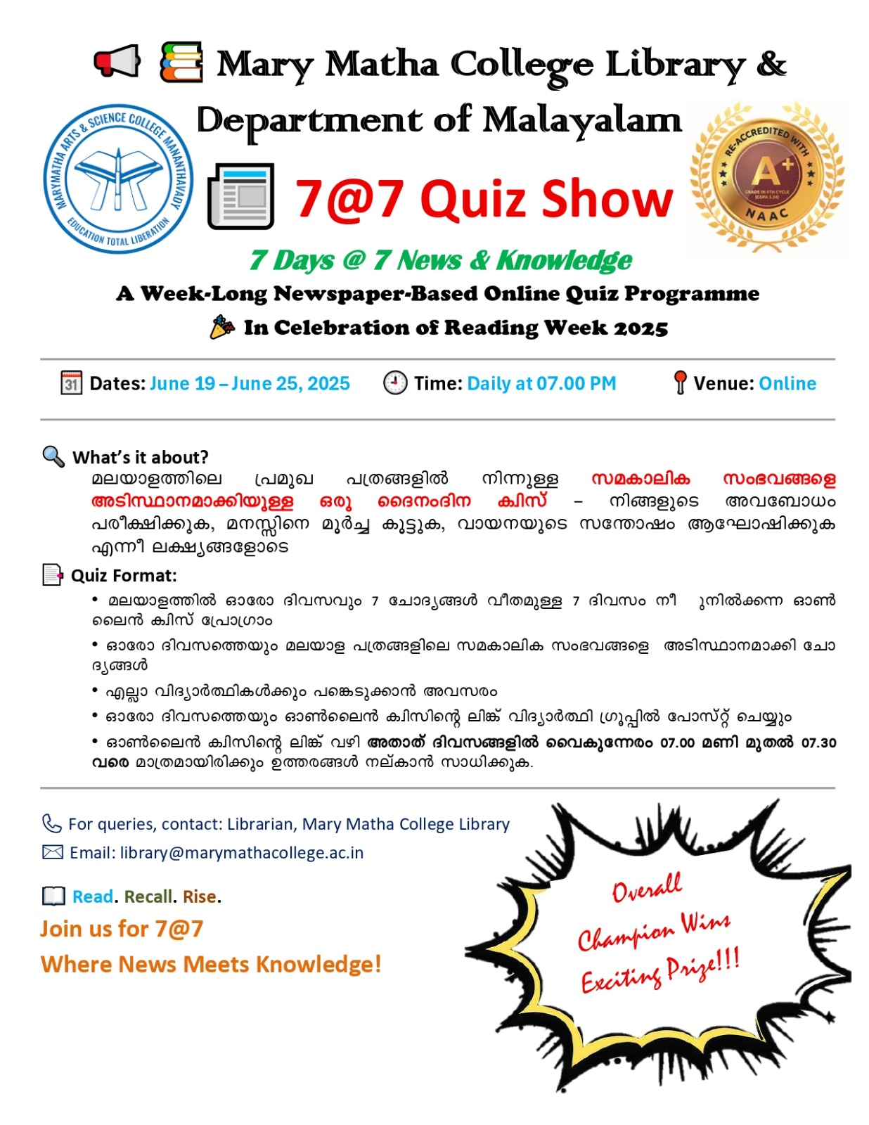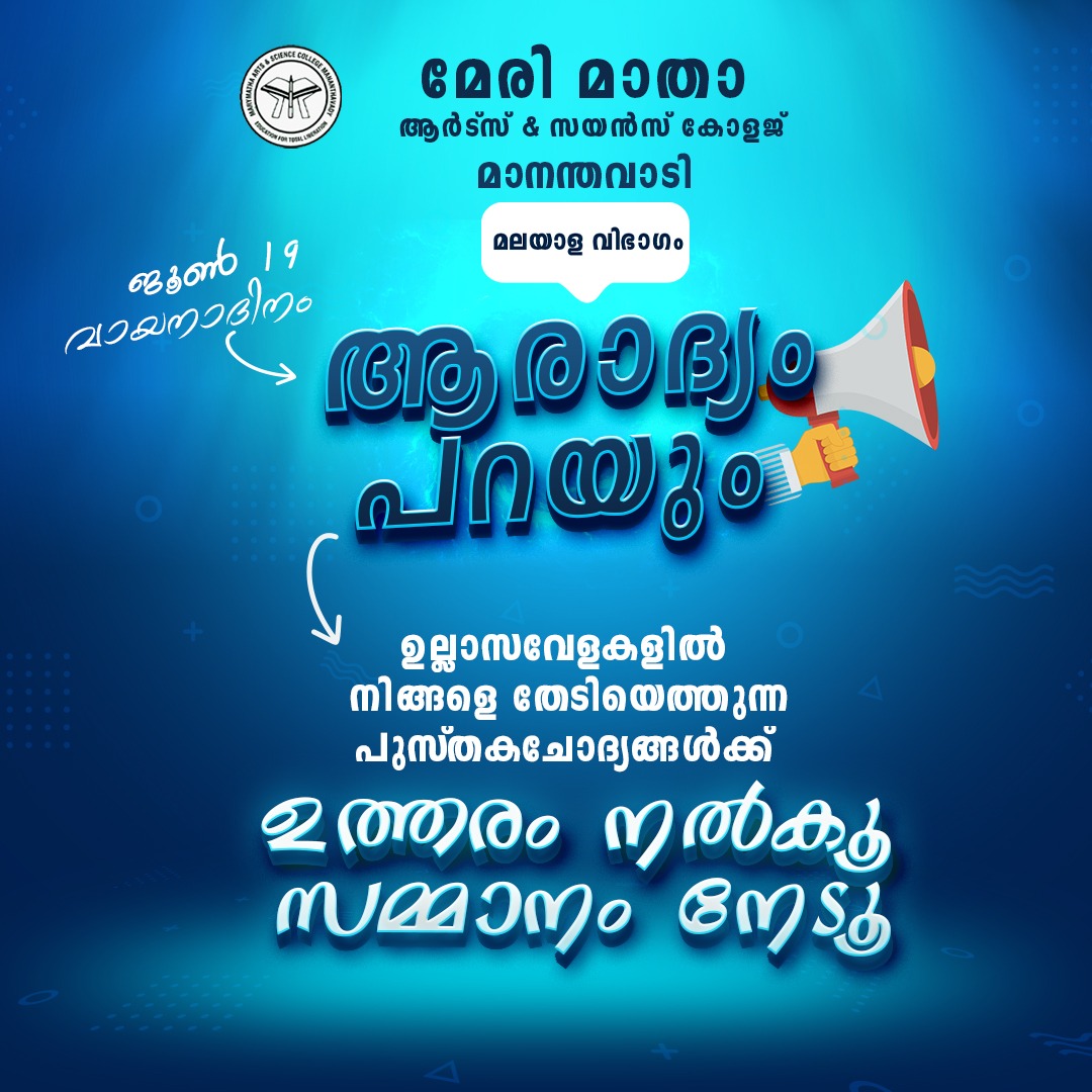 വായനാദിനത്തോടനുബന്ധിച്ച് 19-06-2023 ന് മലയാളം ഡിപ്പാർട്ട്മെന്റ് സംഘടിപ്പിക്കുന്ന പരിപാടികൾ