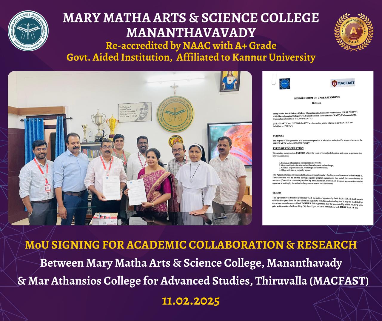 MoU Signed for Academic Collaboration & Research between Mary Matha Arts & Science College, Mananthavady & Mar Athansios College for Advanced Studies, Thiruvalla (MACFAST)