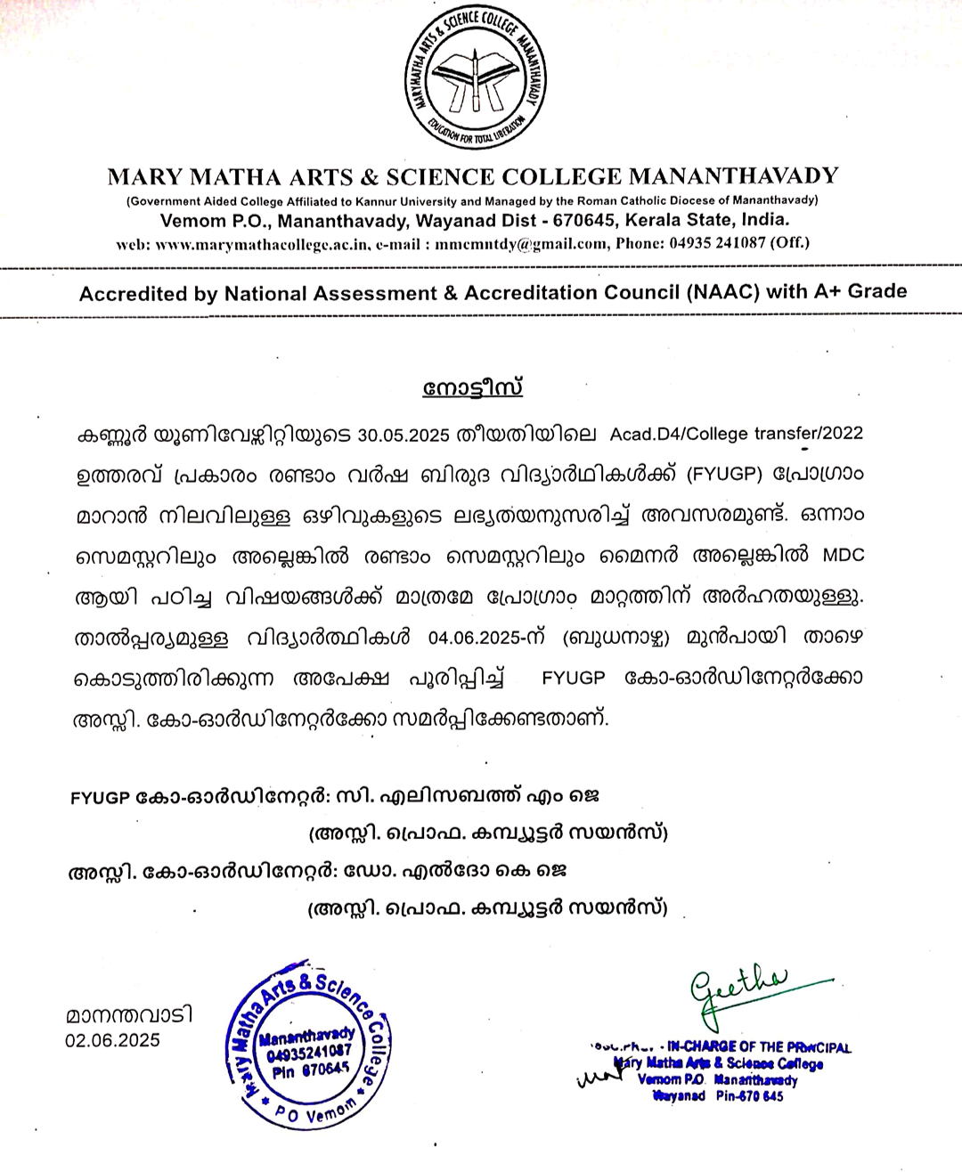 The interview for the post of Guest Lecturer in Chemistry and Physics, which was originally scheduled to be held on May 23, 2025, at Mary Matha Arts & Science College, Mananthavady, for the academic year 2025–26, has been rescheduled to May 26, 2025 (Monday). The revised time schedule is as follows: Chemistry at 9:30 a.m. and Physics at 11:00 a.m. Interested candidates should report to the college office on the day of the interview with: An application in the prescribed format Self-attested copies of relevant documents Original certificates Proof of registration with the Directorate of Collegiate Education Phone numbers: 04935 241087, 9400381087